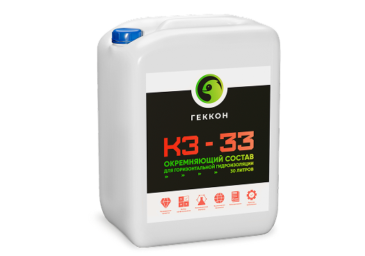 Геккон КЗ-33 - Окремняющий концентрат водноспиртового раствора двух дисиликатов щелочного металла с очень низкой вязкостью и гидрофобных добавок (является аналогом KIESEY производства BOSTIK). Благодаря своей низкой вязкости глубоко проникает в мельчайшие поры и капилляры строительного материала. Вступая в контакт со строительным материалом образует желеобразный горизонтальный водонепроницаемый слой, который способствует высыханию стены. Со временем слой минерализуется и дополнительно укрепляет строительную конструкцию. Образующиеся в процессе минерализации вторичные капилляры являются водоотталкивающими, в результате чего образуется долговечный горизонтальный гидроизоляционный слой.